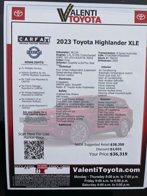 Cutting-edge technology is at your fingertips, with an 8-inch Toyota Audio Multimedia system, seamless smartphone integration, and a suite of advanced safety features including a Rear Parking Camera, Blind Spot Monitoring, and Toyota Safety Sense. Whether you're navigating the daily commute or embarking on a family adventure, the Highlander XLE is designed to keep you connected, protected, and in total command.