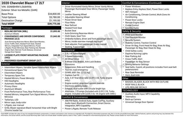 AWD, 4-Wheel Disc Brakes, 6-Speaker Audio System Feature, ABS brakes, AM/FM radio: SiriusXM/Satellite Radio, Apple CarPlay/Android Auto, Black Roof Rails, Black w/Red Outline Blazer Badges, Convenience & Driver Confidence Package, Dual front impact airbags, Dual front side impact airbags, Exterior Parking Camera Rear, Front dual zone A/C, Heated Driver & Front Passenger Seats, Inside Rear-View Auto-Dimming Mirror, Lane Change Alert w/Side Blind Zone Alert, Outside Heated Power-Adjustable Body-Color Mirrors, Power driver seat, Power windows, Radio: Chevrolet Infotainment 3 System, Rear Cross Traffic Alert, Rear Park Assist w/Audible Warning, Rear Power Programmable Liftgate, Rear window defroster, Rear Window Wiper/Defroster, Redline Decals (LPO), Redline Edition, Remote keyless entry, Remote Start, SiriusXM Radio, Speed control, Split folding rear seat, Tilt steering wheel, Universal Home Remote, Wheels: 20 Gloss Black Painted Alum w/Red Accents. CARFAX One-Owner. Clean CARFAX.