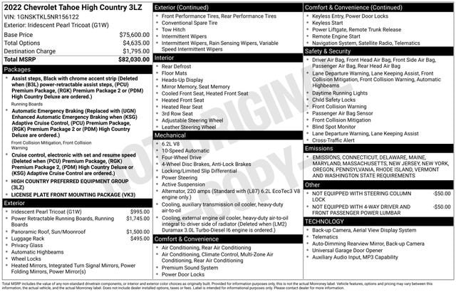 4WD, Jet Black Leather, 10-Way Power Driver & Passenger Seat Adjusters, 3rd row seats: split-bench, ABS brakes, Adaptive Cruise Control, Air Ride Adaptive Suspension, Apple CarPlay/Android Auto, Automatic temperature control, Dual front impact airbags, Dual front side impact airbags, Dual-Pane Paoramic Sunroof, Dual-Pane Power Panoramic Sunroof, Enhanced Automatic Emergency Braking, Front & Rear Park Assist, Heated & Ventilated Driver & Front Passenger Seats, Heated 2nd Row Outboard Seats, Heated steering wheel, High Country Deluxe, Hill Descent Control, LED Daytime Running Lamps, Memory seat, Navigation System, Power driver seat, Power Liftgate, Power windows, Power-Retractable Assist Steps, Premium audio system: Chevrolet Infotainment System 3, Premium Package 2, Rear window defroster, Remote keyless entry, Remote Start, Set of 4 Wheel Locks (LPO), Tilt steering wheel, Ventilated front seats, Wheels: 22 x 9 Sterling Silver Premium Painted. CARFAX One-Owner. Clean CARFAX.