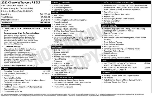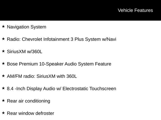 AWD, 8-Way Power Driver Seat Adjuster, 8.4 -Inch Display Audio w/ Electrostatic Touchscreen, ABS brakes, AM/FM radio: SiriusXM with 360L, Apple CarPlay/Android Auto, Bose Premium 10-Speaker Audio System Feature, Dual front impact airbags, Dual front side impact airbags, Dual SkyScape 2-Panel Power Sunroof, Dual-Pane Paoramic Sunroof, Front dual zone A/C, Heated Steering Wheel, Leather steering wheel, Navigation System, Power door mirrors, Power Driver Lumbar Control, Power Liftgate, Power windows, Radio: Chevrolet Infotainment 3 Plus System w/Navi, Rear air conditioning, Rear window defroster, Remote keyless entry, SiriusXM w/360L, Speed control, Tilt steering wheel, Wheels: 20 Dark Aluminum. CARFAX One-Owner. Clean CARFAX.