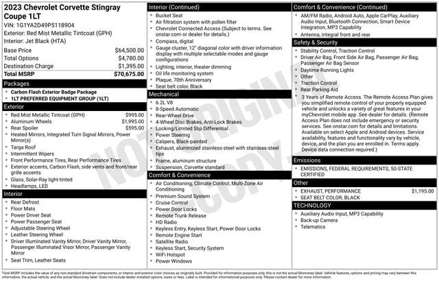 8-Way Power Driver Seat Adjuster, ABS brakes, Apple CarPlay/Android Auto, Bose Premium 10-Speaker Audio System Feature, Dual front impact airbags, Dual front side impact airbags, Front dual zone A/C, HD Radio, Power windows, Preferred Equipment Group 1LT, Radio: Chevrolet Infotainment 3 Plus System, Rear window defroster, Remote keyless entry, SiriusXM Radio, Tilt steering wheel, Wheels: 19 x 8.5 Fr/20 x 11 Rr Bright Silver. Clean CARFAX.