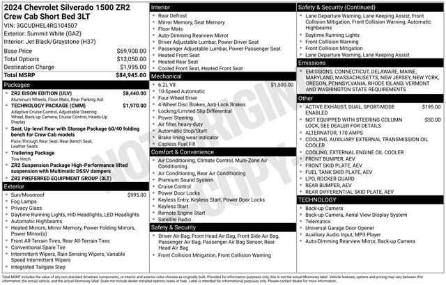 10-Speed Automatic, 4WD, Jet Black/Graystone Leather, 10-Way Power Driver Seat w/Lumbar, 15 Diagonal Multicolor Head-Up Display, 3.23 Rear Axle Ratio, 4-Wheel Disc Brakes, ABS brakes, Adaptive Cruise Control, AEV Front Bumper, AEV Fuel Tank Skid Plate, AEV Rear Bumper, All-Weather AEV Floor Liners (LPO), Assist Step & Tonneau Package III (LPO), Automatic temperature control, Dual front impact airbags, Dual front side impact airbags, Fog Lamps, Front dual zone A/C, Hard-Folding Tonneau Cover (LPO), Heated Driver & Front Outboard Passenger Seats, Multi-Flex Tailgate, Off-Road High Clearance Steps (LPO), Power driver seat, Power Front Passenger Windows w/Express Up/Down, Power passenger seat, Power Rear Windows w/Express Down, Power Sunroof, Power Tilt & Telescoping Steering Column, Premium Bose 7-Speaker Sound System, Radio: Chevrolet Infotainment 3 Premium System, Rear Camera Mirror, Remote keyless entry, Remote Vehicle Starter System, Rocker Protector (LPO), Split folding rear seat, Technology Package, Tilt steering wheel, Trailer Camera Provisions, Ultrasonic Front & Rear Park Assist, Ventilated Driver & Front Passenger Seats, Wheels: 18 x 8.5 Aluminum AEV, ZR2 Bison Edition. CARFAX One-Owner. Clean CARFAX.