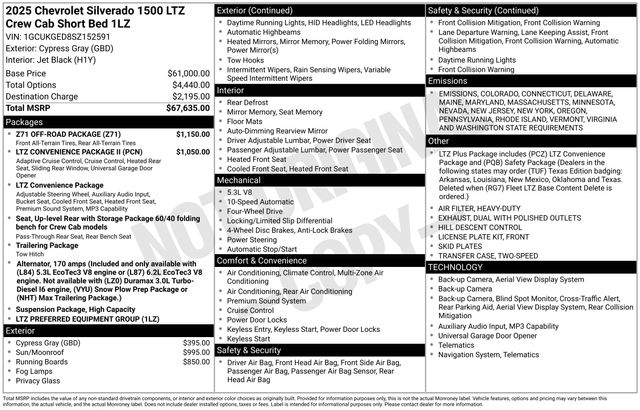 10-Speed Automatic, 4WD, Jet Black Leather, 10-Way Power Passenger Seat Adjuster w/Lumbar, 2 USB Data Ports, ABS brakes, Apple CarPlay/Android Auto, Dual Exhaust w/Black Exhaust Tips, Dual front impact airbags, Dual front side impact airbags, Floor Mounted Center Console, Fog Lamps, Front dual zone A/C, HD Surround Vision, Heated Driver & Front Outboard Passenger Seats, Heavy-Duty Air Filter, Hill Descent Control, LTZ Convenience Package, LTZ Plus Package, Off-Road Suspension, Perimeter Lighting, Power Front Passenger Windows w/Express Up/Down, Power passenger seat, Power Sunroof, Power Tilt & Telescoping Steering Column, Premium Bose 7-Speaker Sound System, Rear Cross Traffic Braking, Rear Pedestrian Alert, Safety Alert Seat, Safety Package, SiriusXM w/360L Trial Subscription, Speed control, Split folding rear seat, Trailer Camera Provisions, Trailer Side Blind Zone Alert, Ultrasonic Front & Rear Park Assist, Ventilated Driver & Front Passenger Seats, Wheels: 20" x 9" Sterling Silver Painted Aluminum, Wireless Charging, Z71 Off-Road Package. CARFAX One-Owner. Clean CARFAX.