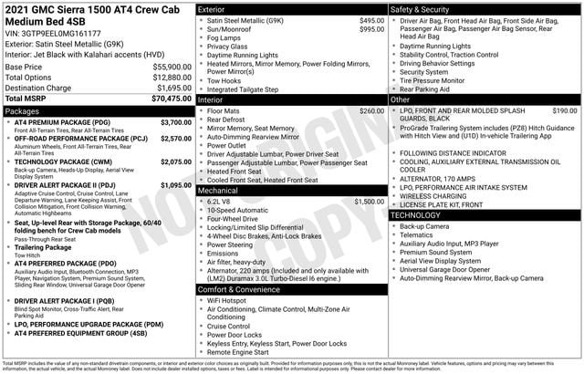 10-Speed Automatic, 4WD, Jet Black With Kalahari Accents Leather, 10-Way Power Passenger Seat Adjuster w/Lumbar, 120-Volt Bed Mounted Power Outlet, 18 x 8.5 Machined Aluminum Wheels, 2 USB Ports (1st Row), 220 Amp Alternator, 4-Wheel Disc Brakes, 4G LTE Wi-Fi Hotspot Capable, 8 Driver Information Center, ABS brakes, Adaptive Cruise Control, Apple CarPlay/Android Auto, AT4 High Clearance Step (LPO), AT4 Preferred Package, AT4 Premium Package, Automatic Emergency Braking, Automatic temperature control, Bed View Camera, Cat-Back Performance Exhaust (LPO), Delay-off headlights, Driver Alert Package I, Driver Alert Package II, Dual front impact airbags, Dual front side impact airbags, Electric Rear-Window Defogger, Fog Lamps, Following Distance Indicator, Forward Collision Alert, Front dual zone A/C, Front Pedestrian Braking, Fully automatic headlights, HD Surround Vision w/2 Trailer View Camera Provisions, Heated 2nd Row Outboard Seats, Heated door mirrors, Heated Driver & Front Outboard Passenger Seating, Heated Second Row Seats/Heated Rear Seats, Illuminated entry, IntelliBeam Automatic High Beam On/Off, Lane Change Alert w/Side Blind Zone Alert, Lane Keep Assist w/Lane Departure Warning, LED Cargo Area Lighting, Manual Tilt-Wheel & Telescoping Steering Column, Memory seat, Multicolor 15 Diagonal Head-Up Display, Off-Road Performance Package (DISC), Off-Road Suspension, Perforated Leather-Appointed Front Seat Trim, Performance Air Intake System (LPO) (DISC), Performance Upgrade Package (LPO) (DISC), Perimeter Lighting, Power Door Locks, Power door mirrors, Power driver seat, Power Front Passenger Windows w/Express Up/Down, Power passenger seat, Power Rear Windows w/Express Down, Power Sliding Rear Window w/Rear Defogger, Power Sunroof, Power windows, Premium Bose 7-Speaker Sound System, Radio: Premium GMC Infotainment Sys w/Navigation, Rear Camera Mirror, Rear Cross Traffic Alert, Rear Wheelhouse Liners, Rear window defroster, Remote keyless entry, Remote Vehicle Starter System, Safety Alert Seat, SiriusXM w/360L, Split folding rear seat, Steering Wheel Audio Controls, Technology Package, Tilt steering wheel, Ultrasonic Front & Rear Park Assist, Universal Home Remote, Ventilated front seats, Wireless Charging.