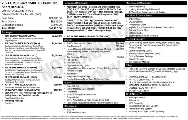 10-Speed Automatic, 4WD, Dark Walnut/Slate Leather, 12-Volt Rear Auxiliary Power Outlet, 120-Volt Bed Mounted Power Outlet, 120-Volt Instrument Panel Power Outlet, 2 USB Ports, 2 USB Ports (1st Row), 4-Wheel Disc Brakes, 6-Speaker Audio System Feature, 8.4 -Inch Display Audio w/ Electrostatic Touchscreen, 8 Driver Information Center, ABS brakes, Adaptive Cruise Control, AM/FM radio: SiriusXM with 360L, Apple CarPlay/Android Auto, Automatic Emergency Braking, Automatic temperature control, Bed View Camera, Chrome Grille, Driver Alert Package II, Driver Memory, Dual Exhaust w/Premium Tips, Dual front impact airbags, Dual front side impact airbags, Dual-Pane Paoramic Sunroof, Floor-Mounted Center Console, Fog Lamps, Following Distance Indicator, Forward Collision Alert, Front anti-roll bar, Front Bucket Seats, Front dual zone A/C, Front Pedestrian Braking, Front wheel independent suspension, Fully automatic headlights, HD Surround Vision w/2 Trailer View Camera Provisions, Heated 2nd Row Outboard Seats, Heated door mirrors, Heated steering wheel, Heavy-Duty Air Filter, Hill Descent Control, IntelliBeam Automatic High Beam On/Off, Keyless Open & Start, Lane Change Alert w/Side Blind Zone Alert, Lane Keep Assist w/Lane Departure Warning, Multicolor 15 Diagonal Head-Up Display, Occupant sensing airbag, Off-Road Suspension, Overhead airbag, Power Door Locks, Power door mirrors, Power Front Passenger Windows w/Express Up/Down, Power Front Windows w/Driver Express Up/Down, Power Rear Windows w/Express Down, Power Sliding Rear Window w/Rear Defogger, Power Sunroof, Premium Bose 7-Speaker Sound System, Radio: Premium GMC Infotainment Sys w/Multi-Touch, Radio: Premium GMC Infotainment Sys w/Navigation, Rear Camera Mirror, Rear window defroster, Remote keyless entry, Remote Vehicle Starter System, Safety Alert Seat, SiriusXM w/360L, SLT Convenience Package, SLT Preferred Package, Speed-sensing steering, Technology Package, Tilt steering wheel, Universal Home Remote, Ventilated Driver & Front Passenger Seats, Wheels: 18 x 8.5 6-Spoke Machined Aluminum, Wireless Charging, X31 Hard Badge, X31 Off-Road Package. Odometer is 27668 miles below market average! CARFAX One-Owner. Clean CARFAX.