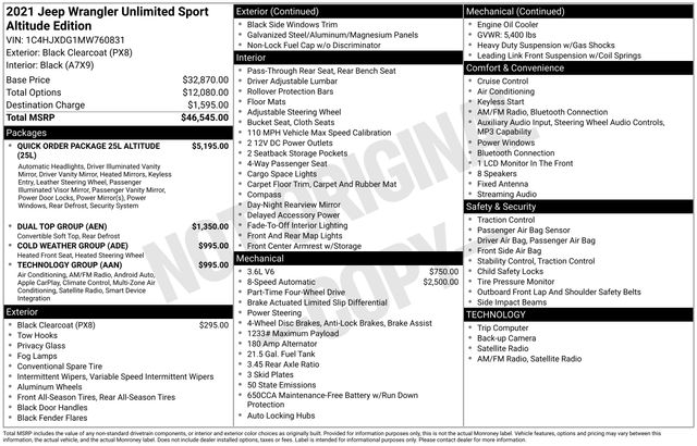 7.0" Touchscreen Display, ABS brakes, Air Conditioning w/Auto Temperature Control, Air Filtering, Apple CarPlay, Automatic Headlamps, Black 3-Piece Hard Top, Black Interior Accents, Black Trail Rated Badge, Body Color Grille w/Gloss Black Rings, Cluster 7.0" TFT Color Display, Cold Weather Group, Deep Tint Sunscreen Windows, Dual front impact airbags, Dual front side impact airbags, Fog Lamps, For More Info, Call 800-643-2112, Freedom Panel Storage Bag, Front 1-Touch Down Power Windows, Google Android Auto, GPS Antenna Input, Heated Front Seats, Heated Steering Wheel, Heavy Duty Suspension w/Gas Shocks, Integrated Center Stack Radio, Leather Wrapped Steering Wheel, Matte Black Jeep Badge, MOPAR Hardtop Headliner, ParkView Rear Back-Up Camera, Power Heated Mirrors, Premium Black Sunrider Soft Top w/Dual Top Group, Quick Order Package 25L Altitude (DISC), Radio: Uconnect 4 w/7" Display, Rear Window Defroster, Rear Window Wiper/Washer, Remote Keyless Entry, Security Alarm, SiriusXM Radio Service, SiriusXM Satellite Radio, Speed control, Speed Sensitive Power Locks, Sun Visors w/Illuminated Vanity Mirrors, Technology Group, USB Host Flip, Wheels: 18" x 7.5" Gloss Black Aluminum, Wizard Black Instrument Panel Bezels, Wrangler Decal. Odometer is 3655 miles below market average! CARFAX One-Owner. Clean CARFAX.