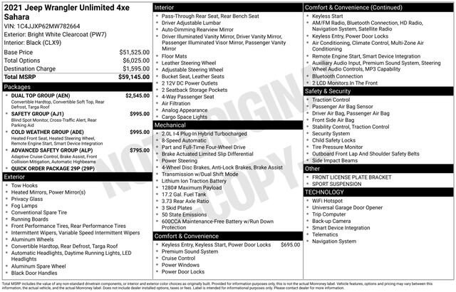 2.0L I4 DOHC, ABS brakes, Adaptive Cruise Control w/Stop, Advanced Brake Assist, Advanced Safety Group, Apple CarPlay/Android Auto, Auto High Beam Headlamp Control, Blind Spot & Cross Path Detection, Body Color Door Handles, Cold Weather Group, Dual front impact airbags, Dual front side impact airbags, Dual Top Group, Fog Lamps, Front dual zone A/C, Full Speed Forward Collision Warning Plus, Heated Front Seats, Heated Steering Wheel, Leather Shift Knob, Leather Trimmed Bucket Seats, Leather Trimmed Seats w/Sahara Logo, ParkSense Rear Park Assist System, ParkView Rear Back-Up Camera, Power windows, Premium Black Sunrider Soft Top w/Dual Top Group, Quick Order Package 29P, Radio: Uconnect 4C Nav w/8.4 Display, Rear Window Wiper/Washer, Remote keyless entry, Remote Start System, Safety Group, Tilt steering wheel, Wheels: 20 x 8 Fully Painted Aluminum. Odometer is 16188 miles below market average! CARFAX One-Owner.