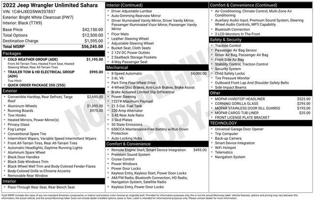 240 Amp Alternator, 3.45 Rear Axle Ratio, 4-Wheel Disc Brakes, 7 & 4 Pin Wiring Harness, 700 Amp Maintenance Free Battery, 8.4 -Inch Display Audio w/ Electrostatic Touchscreen, 9 Speakers, ABS brakes, AM/FM radio: SiriusXM/Satellite Radio, Auxiliary Switches, Body Color 3-Piece Hard Top, Class II Receiver Hitch, Cold Weather Group, Dual front impact airbags, Dual front side impact airbags, Fog Lamps, Freedom Panel Storage Bag, Front dual zone A/C, Heated Front Seats, Heated Steering Wheel, No Soft Top, ParkView Rear Back-Up Camera, Power door mirrors, Power windows, Quick Order Package 25G, Radio: Uconnect 4C Nav w/8.4" Display, Rear Window Defroster, Rear Window Wiper/Washer, Remote keyless entry, Remote Start System, Speed control, Tilt steering wheel, Trailer Tow & HD Electrical Group, Wheels: 18" x 7.5" Tech Gray Machined Face. Odometer is 7480 miles below market average!