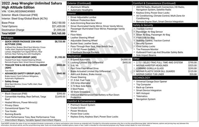 4D Sport Utility, 3.6L V6 24V VVT, 8-Speed Automatic, 4WD, Black Clearcoat, Steel Gray/Global Black w/Leather Trimmed Bucket Seats, 110 MPH Vehicle Max Speed Calibration, 3.73 Rear Axle Ratio, 7 & 4 Pin Wiring Harness, 9 Speakers, ABS brakes, Active Cruise Control, Advanced Brake Assist, Advanced Safety Group, Anti-Lock 4-Wheel FNC Disc Brakes, Auto High Beam Headlamp Control, Auxiliary Switches, Blind Spot & Cross Path Detection, Body Color 3-Piece Hard Top, Body Color Door Handles, Body Color Front Bumper, Body Color Fuel Filler Door, Body Color Grille w/Gloss Black Rings, Body Color Rear Bumper w/Step Pads, Class II Receiver Hitch, Cold Weather Group, Compass, Dana M210 Wide HD Tube Front Axle, Dana M220 Wide Rear Axle, Daytime Running Lamps LED Accents, Electronic Stability Control, Exterior Mirrors w/Supplemental Signals, Fog Lamps, Freedom Panel Storage Bag, Front dual zone A/C, Front LED Fog Lamps, Full Body Color Fender Flares, Full Speed Forward Collision Warning Plus, Fully automatic headlights, Gray/Black Trail Rated Badge, Heated door mirrors, Heated Front Seats, Heated Steering Wheel, High Altitude Package, Illuminated entry, Leather Trimmed Bucket Seats, Leather Wrapped Park Brake Handle, Leather Wrapped Shift Knob, LED Lighting Group, LED Premium Reflector Headlamps, LED Taillamps, Navigation System, No Soft Top, ParkSense Rear Park Assist System, ParkView Rear Back-Up Camera, Premium Dark Exterior Accents, Quick Order Package 25N High Altitude, Radio: Uconnect 4C Nav w/8.4" Display, Rear Window Defroster, Rear Window Wiper/Washer, Remote keyless entry, Remote Start System, Safety Group, Sport Suspension, Summit Badging, Tire Pressure Monitoring System, Traction control, Trailer Tow & HD Electrical Group, Wheels: 20" x 8" Fully Painted Aluminum, Wrapped I/P Bezel w/Caramel Stitch. Odometer is 5331 miles below market average! Clean CARFAX.