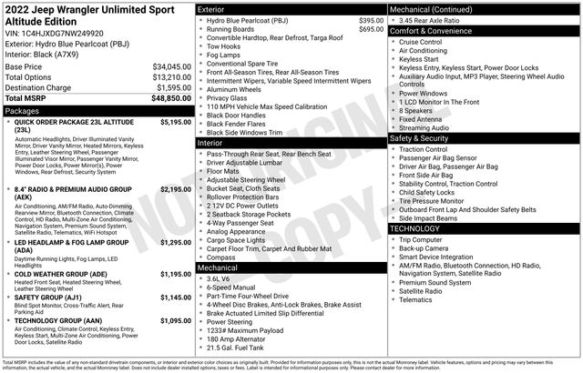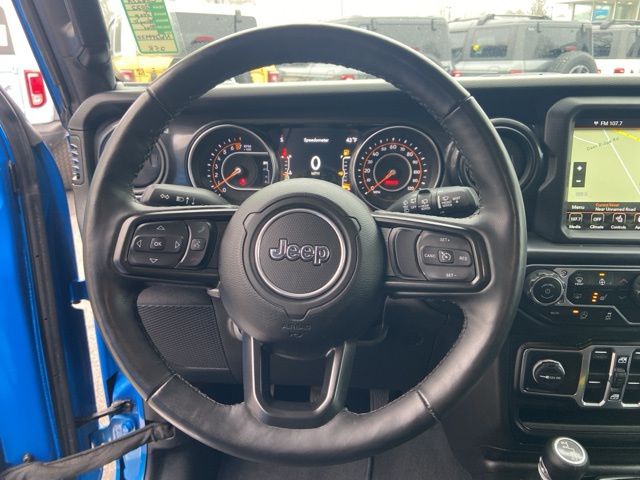 Wrangler Unlimited Sport Altitude, 4D Sport Utility, 3.6L V6 24V VVT, 6-Speed Manual, 4WD, Hydro Blue Pearl Coat, Black Cloth, 110 MPH Vehicle Max Speed Calibration, 2-Door Passive Entry, Front Door Locks, Air Conditioning w/Auto Temperature Control, Air Filtering, Altitude Package, Automatic Headlamps, Black 3-Piece Hard Top, Black Interior Accents, Black Trail Rated Badge, Blind Spot & Cross Path Detection, Body Color Grille w/Gloss Black Rings, Bridgestone Brand Tires, Cluster 7.0" TFT Color Display, Cold Weather Group, Deep Tint Sunscreen Windows, Freedom Panel Storage Bag, Front 1-Touch Down Power Windows, GPS Navigation, Heated Front Seats, Heated Steering Wheel, Heavy Duty Suspension w/Gas Shocks, Injection Molded Black Rear Bumper, Leather Wrapped Steering Wheel, LED Taillamps, Matte Black Jeep Badge, MOPAR Hardtop Headliner, No Soft Top, ParkSense Rear Park Assist System, Power Heated Mirrors, Quick Order Package 23L Altitude, Rear Window Defroster, Rear Window Wiper/Washer, Remote Keyless Entry, Safety Group, Security Alarm, SiriusXM Radio Service, SiriusXM Satellite Radio, Speed Sensitive Power Locks, Sun Visors w/Illuminated Vanity Mirrors, Technology Group, Wheels: 18" x 7.5" Gloss Black Aluminum, Wizard Black Instrument Panel Bezels. Odometer is 16752 miles below market average! CARFAX One-Owner.