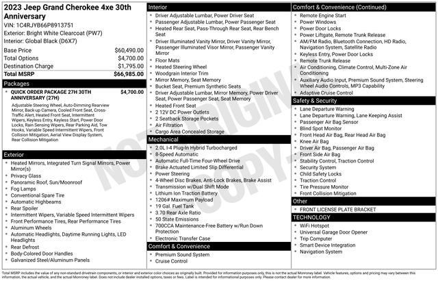 Grand Cherokee 30th Anniversary 4xe, 4D Sport Utility, 2.0L I4 DOHC, 8-Speed Automatic, 4WD, Bright White Clearcoat, Global Black Artificial Leather, ABS brakes, Alloy wheels, Compass, Electronic Stability Control, Front dual zone A/C, Heated door mirrors, Heated rear seats, Heated Second Row Seats/Heated Rear Seats, Illuminated entry, Navigation System, ParkView Rear Back-Up Camera, Power Liftgate, Power moonroof, Remote keyless entry, Tire Pressure Monitoring System, Traction control. Odometer is 10037 miles below market average!