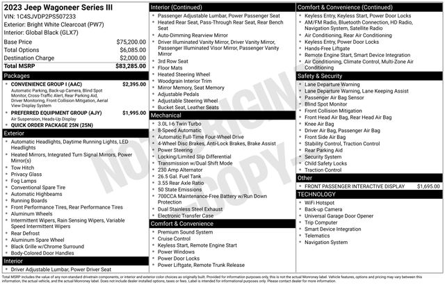Wagoneer Series III, 4D Sport Utility, 3.0L I6, 8-Speed Automatic, 4WD, Bright White Clearcoat, Black Leather, 10 Speakers, 20" x 9.0" Aluminum Wheels, 2nd Row Manual Window Shades, 3rd row seats: bench, 60/40 Power Recline 3rd Row Seat, Active Cruise Control, Brake assist, Convenience Group I, Drowsy Driver Detection, Electronic Stability Control, Exterior Parking Camera Rear, Fog Lamps, Front dual zone A/C, Front Passenger Interactive Display, Fully automatic headlights, Heads-Up Display, Heated rear seats, Heated steering wheel, Intersection Collision Assist System, Leather Trimmed Bucket Seats, Memory seat, Navigation System, P&P Park & Unpark Assist w/Stop System, Power driver seat, Power Liftgate, Preferred Equipment Group, Quadra-Lift Air Suspension, Quick Order Package 25N, Radio: Uconnect 5 Nav w/10.1" Display, Rear air conditioning, Rear window defroster, Remote keyless entry, Semi Active Damping, Side Distance Warning, Surround View Camera System, Telescoping steering wheel, Tilt steering wheel, Traffic Sign Recognition, Ventilated front seats. Odometer is 697 miles below market average! CARFAX One-Owner.
