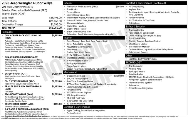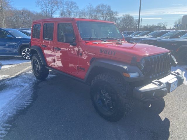 Wrangler Willys, 4D Sport Utility, 2.0L I4 DOHC, 8-Speed Automatic, 4WD, Firecracker Red Clearcoat, Black Cloth, 1-Year SiriusXM Guardian Trial, 115V Auxiliary Power Outlet, 2-Door Passive Entry, Front Door Locks, 220 Amp Alternator, 240 Amp Alternator, 4-Wheel Drive Swing Gate Decal, 4G LTE Wi-Fi Hot Spot, 5-Year SiriusXM Traffic Service, 5-Year SiriusXM Travel Link Service, 7 & 4 Pin Wiring Harness, 700 Amp Maintenance Free Battery, 8.4" Radio & Premium Audio Group, 8.4" Touchscreen Display, Air Conditioning w/Auto Temperature Control, Air Filtering, Alpine Premium Audio System, Anti-Spin Differential Rear Axle, Apple CarPlay, Auto-Dimming Rear-View Mirror, Automatic Headlamps, Auxiliary Switches, Black Grille, Blind Spot & Cross Path Detection, Class II Receiver Hitch, Cluster 7.0" TFT Color Display, Cold Weather Group, Console Bin Task Light, Convenience Group, Deep Tint Sunscreen Windows, Emergency/Assistance Call, Front 1-Touch Down Power Windows, Front LED Fog Lamps, Google Android Auto, GPS Antenna Input, GPS Navigation, HD Radio, Heated Front Seats, Heated Steering Wheel, Injection Molded Black Rear Bumper, Integrated Center Stack Radio, Integrated Voice Command w/Bluetooth, LED Headlamp & Fog Lamp Group, LED Premium Reflector Headlamps, LED Taillamps, Media Hub-2 USBS (Both Charge Only), Mold In Color Bumper w/Gloss Black, MOPAR All-Weather Floor Mats, Off-Road Info Pages, ParkSense Rear Park Assist System, Power Heated Mirrors, Power Top Quarter Window Storage Bag, Premium Wrapped Steering Wheel, Quick Order Package 22W Willys, Radio: Uconnect 4C Nav w/8.4" Display, Rear Window Defroster, Rear Window Wiper/Washer, Remote Keyless Entry, Remote USB Port - Charge Only, Removable Rear Quarter Windows, Safety Group, Security Alarm, SiriusXM Satellite Radio, SiriusXM Traffic Plus, SiriusXM Travel Link, Sky 1-Touch Power Top, Speed Sensitive Power Locks, Sun and Sound Package, Sun Visors w/Illuminated Vanity Mirrors, Technology Group, Trailer Tow & Aux Switch Group, Universal Garage Door Opener, USB Host Flip, Wheels: 17" x 7.5" Black Aluminum, Willys, Willys Hood Decal. Odometer is 7483 miles below market average! CARFAX One-Owner. Clean CARFAX.