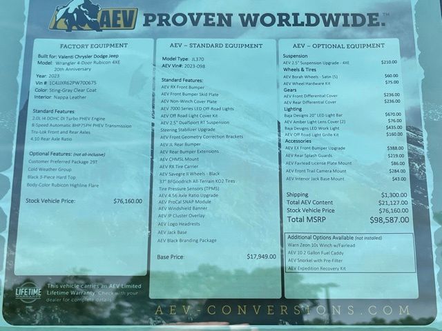 Alloy Wheels, Appearance Package, Backup Camera, Bluetooth, Navigation System, Remote Start, Tow Package, 2.0L I4 DOHC, 20th Anniversary Rubicon 4xe Suspension, 4-Wheel Disc Brakes, 7 & 4 Pin Wiring Harness, 700 Amp Maintenance Free Battery, ABS brakes, Apple CarPlay/Android Auto, Automatic temperature control, Auxiliary Switches, Bi-Xenon HID Headlamps, Black 3-Piece Hard Top, Body Color Rubicon Highline Flare, Class II Receiver Hitch, Cold Weather Group, Corning Gorilla Glass, Electronic Stability Control, Fog Lamps, Freedom Panel Storage Bag, Front dual zone A/C, Heated door mirrors, Heated Front Seats, Heated Steering Wheel, Integrated Off-Road Camera, Leather Trimmed Bucket Seats, Leather Wrapped Park Brake Handle, Leather Wrapped Shift Knob, MOPAR All-Weather Floor Mats, MOPAR Rubicon 20th Anniversary Tool Kit, Nappa Leather Seats, No Soft Top, ParkView Rear Back-Up Camera, Performance Suspension, Power door mirrors, Power steering, Power windows, Premium Door Trim Panel, Premium Wrapped I/P Bezels, Premium Wrapped Red I/P Bezels, Quick Order Package 29T Rubicon 20th Anniversary, Radio: Uconnect 4C Nav w/8.4" Display, Rear Window Defroster, Rear Window Wiper/Washer, Red Interior Accents, Red Seat Belt, Remote keyless entry, Remote Start System, Rubicon 20th Anniversary, Rubicon 20th Anniversary Grille, Rubicon 20th Anniversary Shifter Medallion, Rubicon 20th Anniversary Side Hood Decal 4xe, Rubicon 20th Anniversary Swing Gate Plaque, Rubicon 20th Anniversary Top Hood Decal 4xe, Speed control, Split folding rear seat, Steel Bumper Group, Steel Front Bumper, Steel Rear Bumper, Tilt steering wheel, Tire Pressure Monitoring System, Traction control, Trip computer. Odometer is 31587 miles below market average!