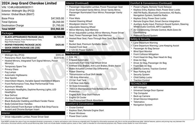 Grand Cherokee Limited, 4D Sport Utility, 3.6L V6 24V VVT, 8-Speed Automatic, 4WD, Midnight Sky, Global Black Artificial Leather, Black Appearance Package, Dual-Pane Panoramic Sunroof, Gloss Black Exterior Accents, Quick Order Package 23E, Wheels: 20" x 8.5" Gloss Black Painted Aluminum. CARFAX One-Owner. Clean CARFAX.