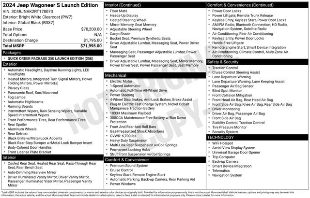 Wagoneer S Launch Edition, 4D Sport Utility, Electric Motor, 1-Speed Automatic, 4WD, Bright White Clearcoat, Global Black, 19 Speakers, Active Cruise Control, Apple CarPlay/Android Auto, Front dual zone A/C, Heads-Up Display, Heated rear seats, Heated steering wheel, Memory seat, Navigation System, ParkView Rear Back-Up Camera, Power moonroof, Quick Order Package 25E Launch Edition, Radio: Uconnect 5 Nav w/12.3" Display, Rear air conditioning, Remote keyless entry, Ventilated front seats, Ventilated rear seats, Wheels: 20" x 8.5" Gloss Black Painted Aluminum (DISC). Odometer is 3986 miles below market average! CARFAX One-Owner. Clean CARFAX.