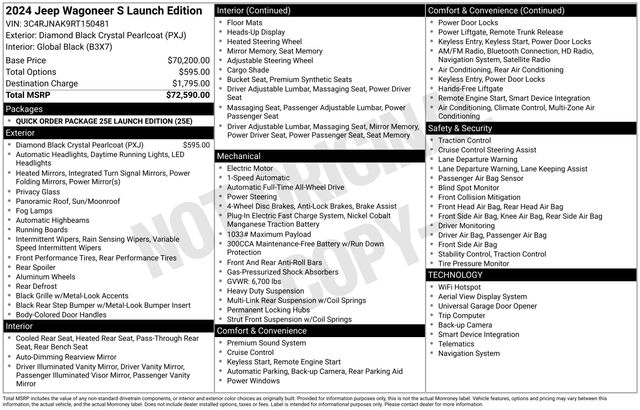Wagoneer S Launch Edition, 4D Sport Utility, Electric Motor, 1-Speed Automatic, 4WD, Diamond Black Crystal Pearlcoat, Global Black, 19 Speakers, Active Cruise Control, Apple CarPlay/Android Auto, Front dual zone A/C, Heated rear seats, Heated steering wheel, Memory seat, ParkView Rear Back-Up Camera, Power driver seat, Power Liftgate, Power moonroof, Quick Order Package 25E Launch Edition, Radio: Uconnect 5 Nav w/12.3" Display, Telescoping steering wheel, Tilt steering wheel, Ventilated front seats, Ventilated rear seats, Wheels: 20" x 8.5" Gloss Black Painted Aluminum (DISC). Odometer is 4416 miles below market average! CARFAX One-Owner. Clean CARFAX.