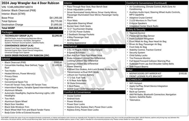Wrangler Rubicon 4xe, 4D Sport Utility, 2.0L I4 DOHC, 8-Speed Automatic, 4WD, Black Clearcoat, Black Cloth, 12.3" Touchscreen Display, 4.10 Rear Axle Ratio, 4G LTE Wi-Fi Hot Spot, Active Cruise Control, Alpine Premium Audio System, Apple CarPlay/Android Auto, Auto-Dimming Rear-View Mirror, Automatic temperature control, Auxiliary Switches, Black 3-Piece Hard Top, Class II Receiver Hitch, Convenience Group, Disassociated Touchscreen Display, Fog Lamps, Freedom Panel Storage Bag, Front dual zone A/C, Fully automatic headlights, Google Android Auto, GPS Navigation, HD Radio, Heated Front Seats, Heated Steering Wheel, Integrated Center Stack Radio, Integrated Off-Road Camera, Integrated Voice Command w/Bluetooth, No Soft Top, ParkView Rear Back-Up Camera, Quick Order Package 29V Rubicon, Radio: Uconnect 5 Nav w/12.3" Display, Rear Window Defroster, Rear Window Wiper/Washer, Remote Start System, SiriusXM Radio Service, SiriusXM w/360L, Split folding rear seat, Technology Group, Trailer Tow & Aux Switch Group, Universal Garage Door Opener. Odometer is 3358 miles below market average!