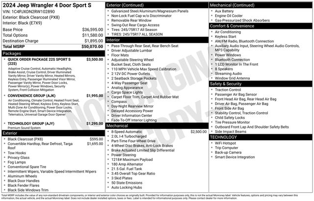 Wrangler Sport S, 4D Sport Utility, 2.0L I4 DOHC, 8-Speed Automatic, 4WD, Black Clearcoat, Black Cloth, 2-Door Passive Entry, Front Door Locks, 240 Amp Alternator, 8 Speakers, ABS brakes, Advanced Brake Assist, Air Conditioning w/Auto Temperature Control, Alpine Premium Audio System, Apple CarPlay/Android Auto, Automatic Headlamps, Black 3-Piece Hard Top, Cloth Low-Back Bucket Seats, Cluster 7.0" TFT Color Display, Compass, Convenience Group, Deep Tint Sunscreen Windows, Electronic Stability Control, Emergency/Assistance Call, Enhanced Adaptive Cruise Control, Fog Lamps, Front 1-Touch Down Power Windows, Full Speed Forward Collision Warning Plus, Heated Front Seats, Heated Steering Wheel, No Soft Top, ParkView Rear Back-Up Camera, Power Heated Mirrors, Premium Wrapped Steering Wheel, Quick Order Package 22S Sport S, Radio: Uconnect 5 w/12.3" Display, Rear Window Defroster, Rear Window Wiper/Washer, Remote Keyless Entry, Remote Start System, Security Alarm, Speed Sensitive Power Locks, Split folding rear seat, Sport S, Sun Visors w/Illuminated Vanity Mirrors, Technology Group, Tire Pressure Monitoring System, Traction control, Universal Garage Door Opener, Wheels: 17" x 7.5" Gray. Odometer is 12804 miles below market average! CARFAX One-Owner. Clean CARFAX.