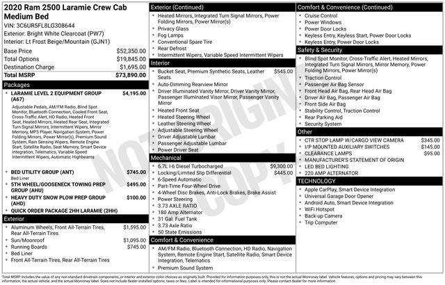 Recent Arrival! 2500 Laramie, 4D Crew Cab, Cummins 6.7L I6 Turbodiesel, 6-Speed Automatic, 4WD, Bright White Clearcoat, Lt Frost Beige/Mountain Leather, #1 Seat Foam Cushion, 115V Auxiliary Rear Power Outlet, 17 Speaker harman kardon Premium Sound, 2 Way Rear Headrest Seat, 220 Amp Alternator, 2nd Row In Floor Storage Bins, 4 Way Front Headrests, 5-Year SiriusXM Traffic Service, 5-Year SiriusXM Travel Link Service, 5th Wheel/Gooseneck Towing Prep Group, 8.4" Touchscreen Display, Apple CarPlay, Auto High Beam Headlamp Control, Bed Utility Group, Blind Spot & Cross Path Detection, Bucket Seats, Deployable Bed Step, Disassociated Touchscreen Display, Exterior Mirrors w/Memory, Folding Flat Load Floor Storage, For Details Visit DriveUconnect.com, Front Seat Back Map Pockets, Full Length Upgraded Floor Console, Google Android Auto, GPS Antenna Input, GPS Navigation, HD Radio, Heated Front Seats, Heated Second Row Seats, Heated Steering Wheel, Heavy Duty Snow Plow Prep Group, High Back Seats, Integrated Center Stack Radio, Integrated Voice Command w/Bluetooth, Laramie Level 2 Equipment Group, Leather Trimmed Bucket Seats, LED Bed Lighting, Media Hub w/2 Charge Only USBs, Mirror-Mounted Aux Reverse Lamps, ParkView Rear Back-Up Camera, Power 2-Way Driver Lumbar Adjust, Power 2-Way Passenger Lumbar Adjust, Power Adjust 8-Way Driver Seat, Power Adjust 8-Way Front Passenger Seat, Power Adjustable Convex Aux Mirrors, Power Adjustable Pedals w/Memory, Power Chrome Tow Mirrors w/Convex Spotter & Memory, Power Sunroof, Quick Order Package 2HH Laramie, Radio: Uconnect 4C Nav w/8.4" Display, Radio/Driver Seat/Mirrors/Pedals Memory, Rain Sensitive Windshield Wipers, Rear 60/40 Folding Seat, Remote Tailgate Release, SiriusXM Satellite Radio, Spray In Bedliner, USB Host Flip, Ventilated Front Seats. Odometer is 3918 miles below market average! Clean CARFAX.