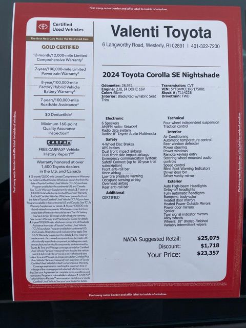 Blending style, technology, and efficiency, this 2024 Toyota Corolla SE Nightshade is the perfect companion for the discerning driver. With its impressive list of features and Certified pre-owned status, this Corolla represents an exceptional value proposition. We invite you to schedule a test drive and discover the exceptional driving experience that awaits you.